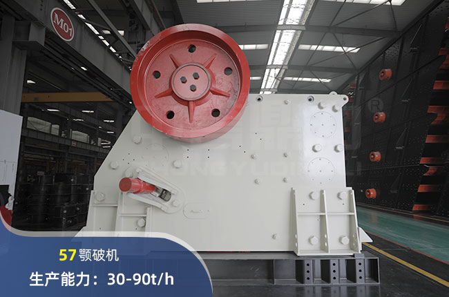 57顎式破碎機偏心軸轉(zhuǎn)速為250r/min,搭配55kw電機,電動機型號為Y315-8,轉(zhuǎn)速是720r/min,該設備不含電機重10.5噸。