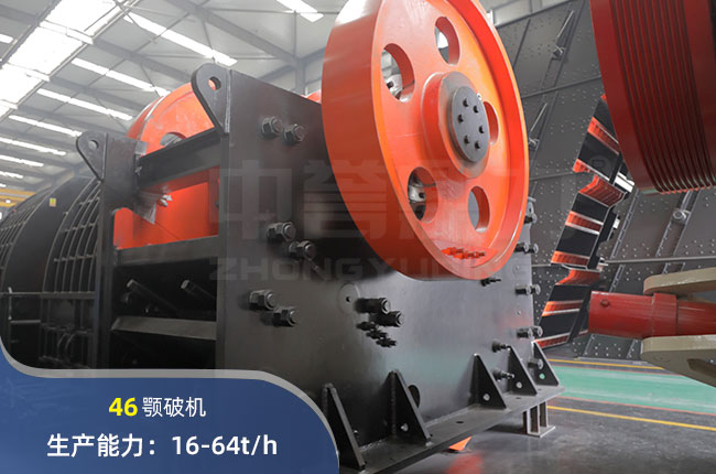 46破碎機每小時產量16-64噸,設備進料尺寸為400x600mm,可破粒度小于340mm的花崗巖,石灰石,玄武巖等硬度小于320兆帕的各種巖石。