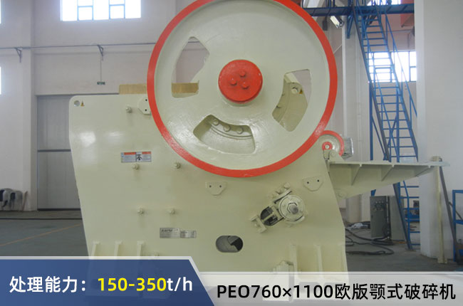 PEO760×1100歐版顎式破碎機進料粒度≤620mm,排料口調節(jié)范圍75-200mm,時產量150-350噸,配置電動機功率是100-132Kw,機器重量在24噸左右。