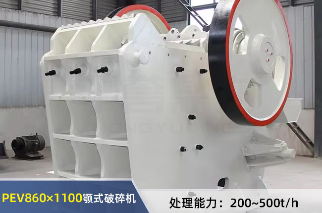 PEV860×1100顎式破碎機進料大小≤730mm,出料100-200mm之間,時產量在200-500噸,配置功率110-132千瓦電機,設備外形尺寸為4870×2850×3170mm,重量為32噸。