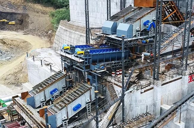 夢皓礦業(yè)時產(chǎn)2000噸生產(chǎn)線由兩條時產(chǎn)1000噸的砂石骨料生產(chǎn)線組成,采用干濕結(jié)合的工藝。該生產(chǎn)線利用場地地形落差進(jìn)行建設(shè),巧妙地對于含泥量較高的原料,采用水洗骨料生產(chǎn)線進(jìn)行處理,該生產(chǎn)線使用了水洗線采用已使用近10年的1620重錘破及整套配設(shè)備,新建骨料生產(chǎn)線配備了1815重錘式破碎機(jī)、1622二破和3080稀油振動篩等設(shè)備,可產(chǎn)出246碎石、瓜子片、水洗砂、58子等8種不同規(guī)格的骨料產(chǎn)品。