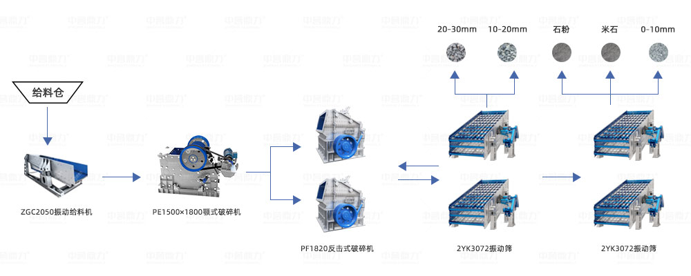 2、顎式破碎機(jī)+反擊式破碎機(jī)【中等硬度物料選擇】