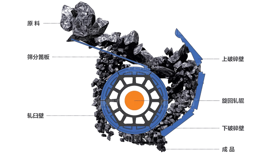 通過(guò)以下原理圖,可以看出,原料從進(jìn)料口進(jìn)入機(jī)破碎腔,會(huì)先通過(guò)篩分篦板進(jìn)行預(yù)分離處理,將小塊成品大小碎石分離出去,其它石頭會(huì)進(jìn)入破碎腔,通過(guò)軋臼壁及破碎壁的擠壓,實(shí)現(xiàn)對(duì)石頭的破碎處理。臥式旋回破工作時(shí)旋回破碎輥會(huì)產(chǎn)生反向自轉(zhuǎn),使軋臼壁磨損更加均勻,避免因局部磨損更換整個(gè)部件的現(xiàn)象。另外排料口采用液壓調(diào)整,可以智能調(diào)整排料口大小。