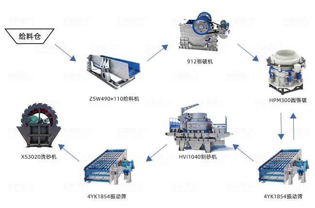 一般對于鵝卵石破碎制砂會采用粗碎、中細碎、制砂三級破碎工藝,但如鵝卵石原料粒度較小(小于30mm),可直接節省粗碎、中細碎環節,直接通過制砂機制砂,然后根據需求搭配給料、篩分、輸送等設備,如要高品質水洗砂,需要在增加水洗工藝,可采用螺旋洗砂機或輪斗洗砂機。